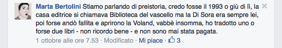 Bene. Ma nel post in questione c’è chi lamenta di pagamenti non avventi già nel 2009 e sarebbe bene rispondere anche a quello screenshot, che non potendo postare riporto integralmente: “Mi spiace di doverla smentire, ma io HO lavorato per voi, traducendo un romanzo consegnato nel 2008, (più di due anni e mezzo fa, quindi…) e retribuito, parzialmente e dopo infiniti, estenuanti, imbarazzanti solleciti, a scaglioni fra il 2009 e il 2011. Poiché non mi sono stati corrisposti gli ultimi 1000e rotti euro, nel 2012 – quasi cinque anni dopo la consegna – lei si è personalmente premurata di farmi sapere (passando bruscamente dal “tu” al “lei” e dal “siamo in reale difficoltà” a “lei ha già ricevuto anche più di quel che il suo lavoro meritava”) che quest’ultima parte di denaro non mi sarebbe stata corrisposta in quanto la mia traduzione era fatta male. Cosa che non era mai venuta fuori prima, e che avrebbe evidentemente comportato da parte mia un ulteriore lavoro sul testo – che mi ero comunque proposta di fare – e da parte vostra magari una formalizzazione del nuovo compenso pattuito. A questo punto, non posso che pensare che anche le presunte inadempienze di Federico Di Vita non siano altro che una delle sue piccole scuse per giustificare la sua politica, ovvero cercare di far tirare il collo a persone che non staranno certo a mobilitare un avvocato per 400 euro. Chi ha imparato a conoscerla a proprie spese, cara signora, ormai sa che Voland è anche questo. Milena Djokovic”