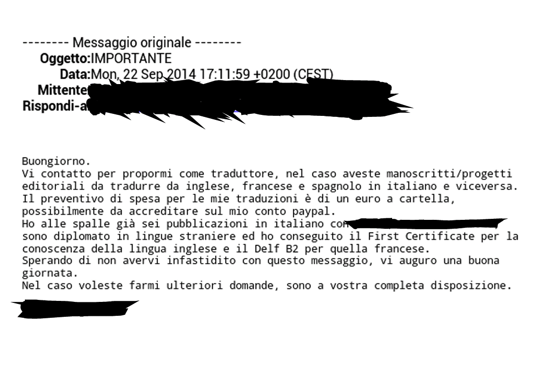 Infine (e la chiudo qui per non dilungarmi) la signora DI Sora non ha ancora risposto alla domanda: “Perché quando commissione un lavoro, anche una certa urgenza, non avverte i redattori o i traduttori a cui assegna il lavoro che ci sono ottime probabilità che il pagamento non sia puntuale? Non le sembra una mancanza di rispetto nei confronti di chi lavora per lei?”